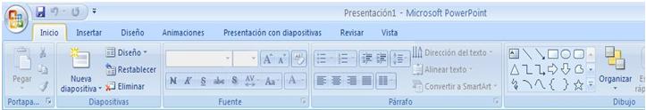 En esta pestaña se encuentran las funciones asociadas con: copiar, pegar, cortar y copiar formato; agregar o eliminar diapositiva y su diseño; aplicar formato de la fuente y de párrafos; dibujar formas y organizarlas; buscar, reemplazar y seleccionar texto u objetos.