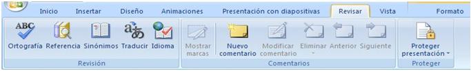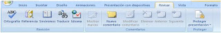 Con las funciones de esta barra se puede revisar ortografía, incluir referencias, traducir, sugerir sinónimos, insertar comentarios y proteger la presentación restringiendo su modo de acceso.