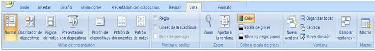 Con esta pestaña se manejan los diferentes tipos de vista de la presentación o diapositiva, la regla o cuadrícula, se controla el zoom para acercar o alejar el documento, se puede mostrar a color o escala de grises la presentación, organizar y moverse entre las ventanas utilizadas, y manejo de los macros